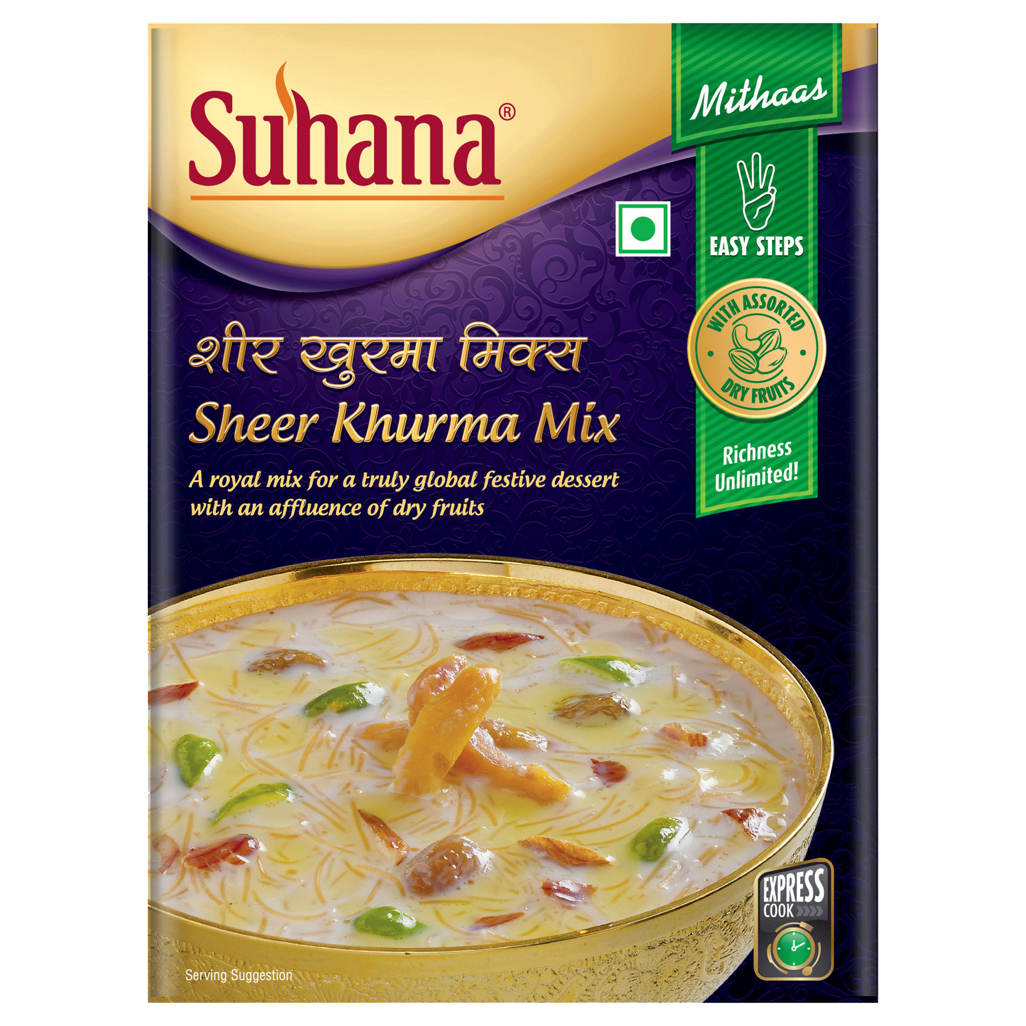 'Sheer' means sweetened milk and 'Khurma' means dates. The sheer khurma is creamy, rich, and flavourful preparation loaded with dry fruits like dates, pistachios, cashew nuts with a hint of cardamom. Suhana Sheer Khurma Instant Mix holds the royalness of the homemade traditional dessert rich in flavors and simple to make. So get set for Shahi Dawat.